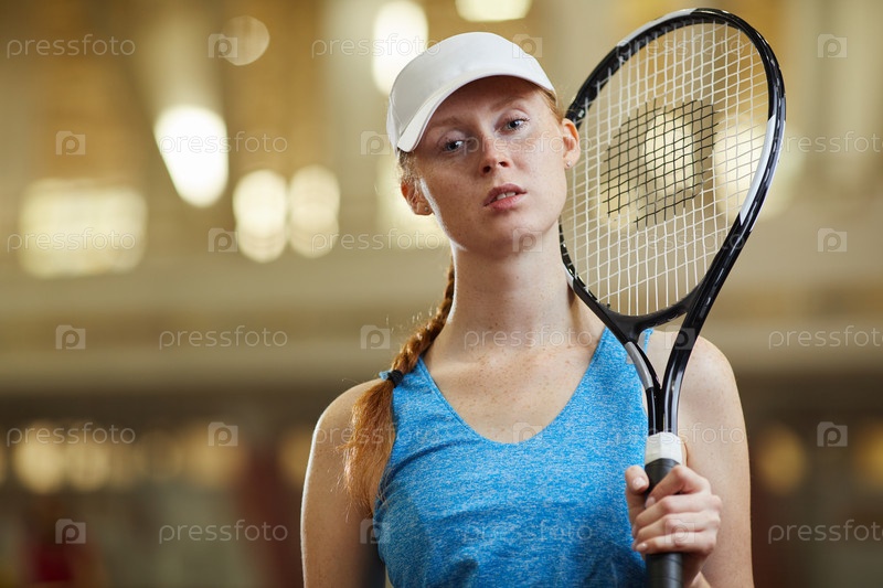 Портрет серьезной уверенной молодой рыжеволосой леди в белом шапке, стоящей на корте и держащей теннисную ракетку