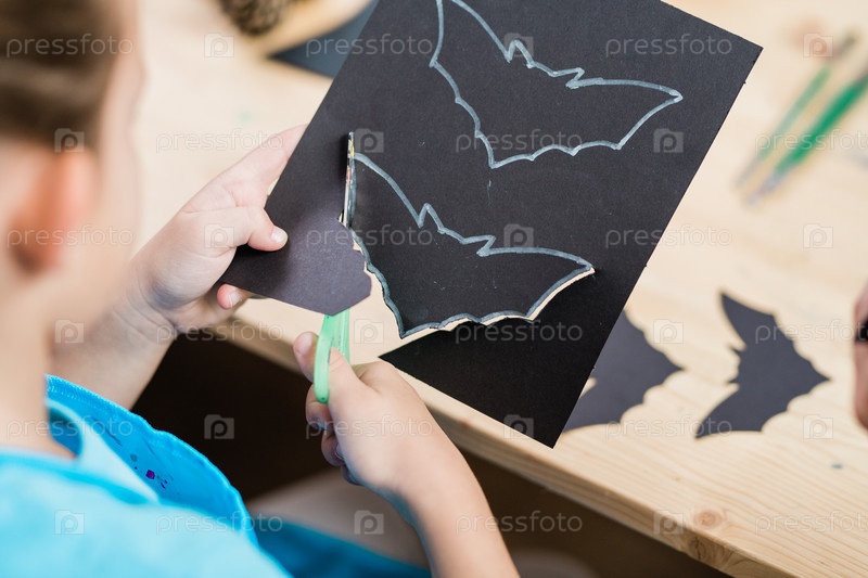 Руки учеников начальных классов вырезают летучую мышь Хэллоуина из черной бумаги
