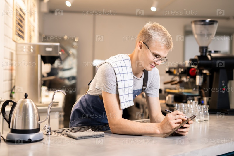 Красивый парень в фартуке и футболке просматривает заказы в своей тетради
