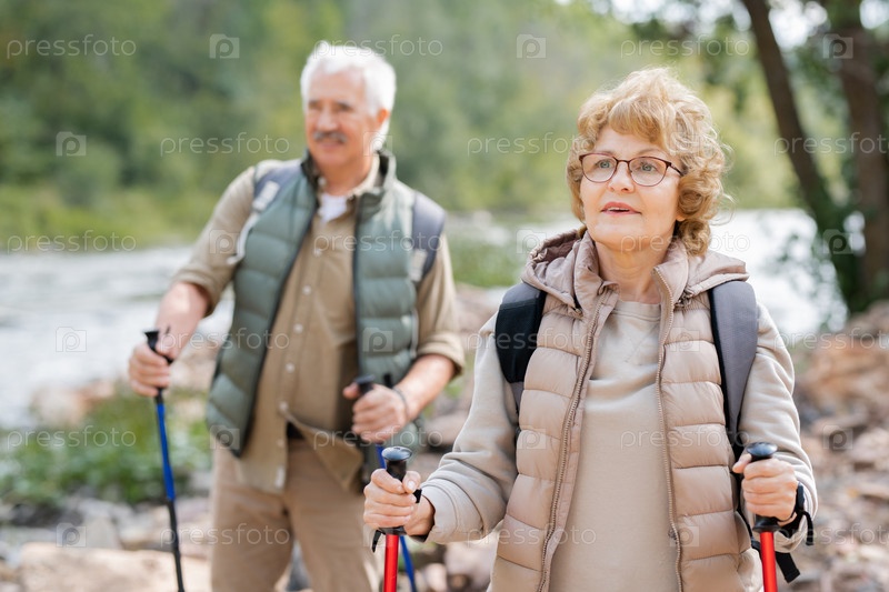 Довольно зрелая женщина-путешественница и ее муж переезжают вниз по берегу реки
