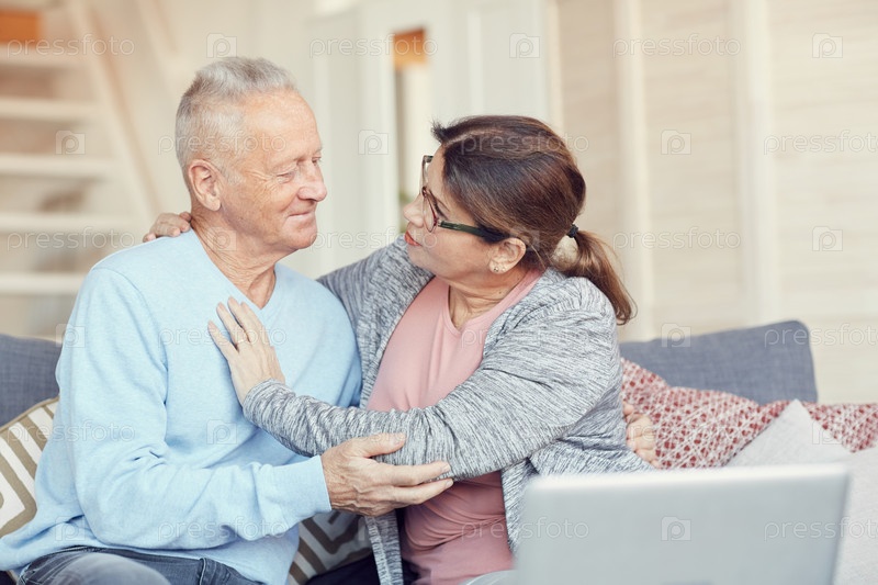 Обеспокоенная любящая старшая жена сидит на диване и обнимает мужа, спрашивая его о здоровье