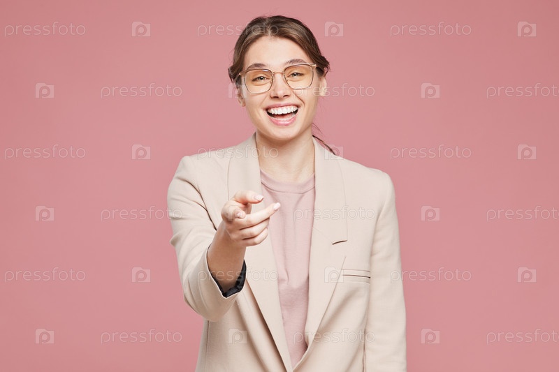 Портрет позитивной красивой девушки в стильных очках и бежевом куртке, стоящей на розовом фоне и смеющейся, показывая пальцем на камеру