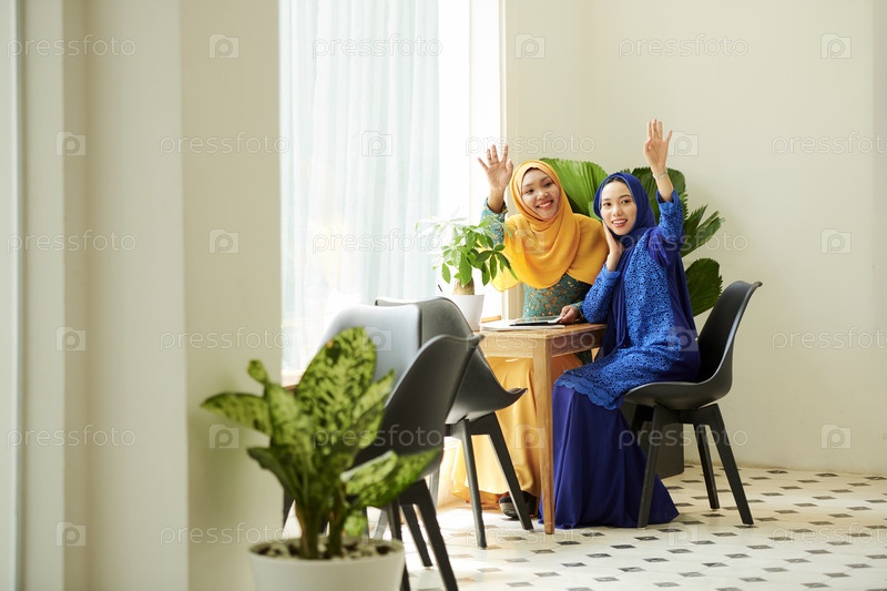 Юонг-женщины ждут официанта в кафе