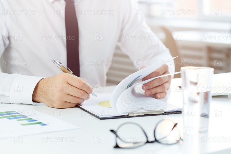 Близкий план неузнаваемого бизнесмена в белой рубашке, сидящего за столом и просматривающего финансовый отчет в офисе
