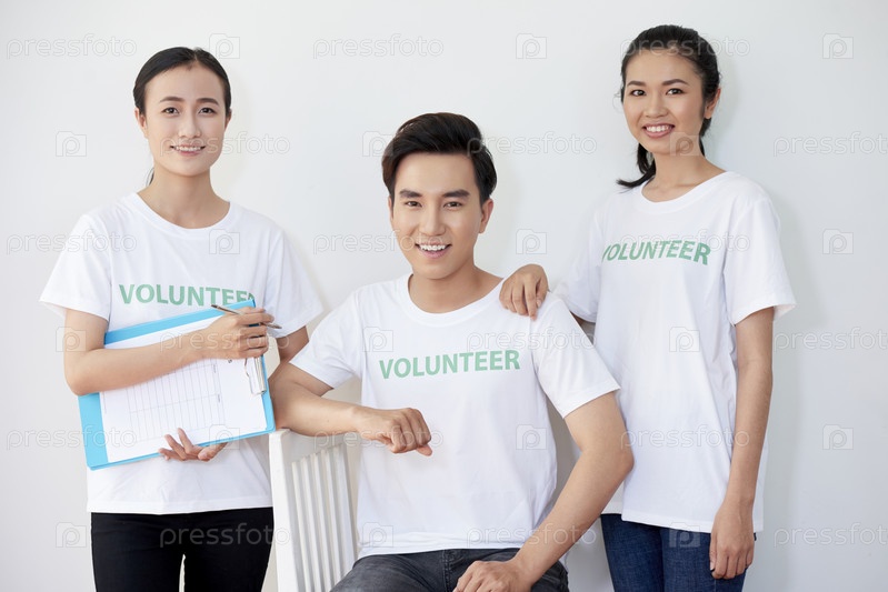 Улыбающаяся группа добровольцев на белом фоне