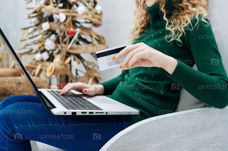 Молодая женщина покупает онлайн на Рождество
