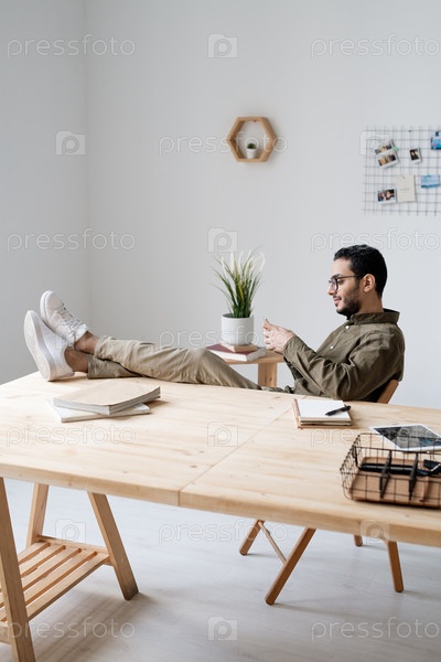 Молодой сотрудник со смартфоном сидит у рабочего места с ногами на столе