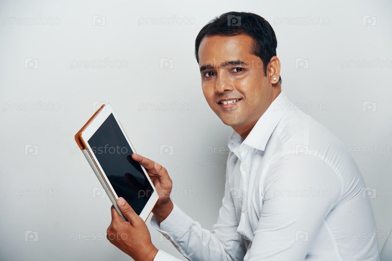Офисный работник, использующий цифровой планшет