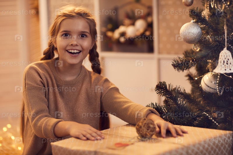 Портрет веселой возбужденной красивой девушки, стоящей в гостиной с елкой и распаковывающей большой рождественский подарок