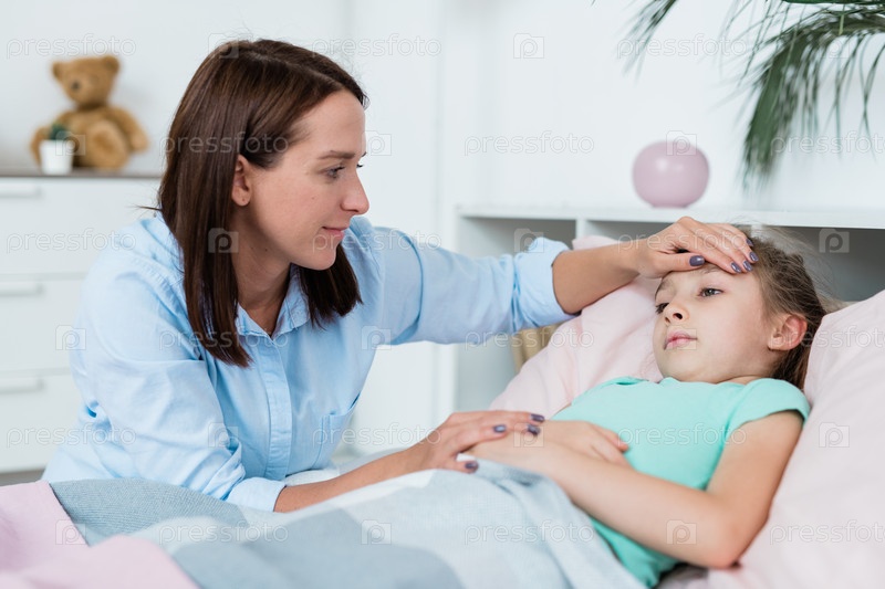 Молодая брюнетка смотрит на свою больную дочь, прикасаясь к лбу