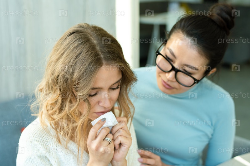 Молодая азиатская женщина в очках утешает свою расстроенную подругу в кафе