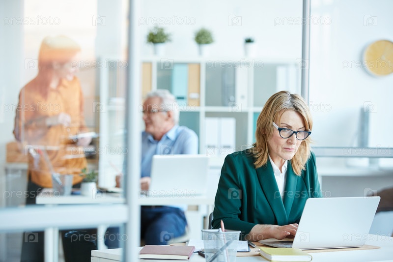 Зрелая женщина печатает на ноутбуке