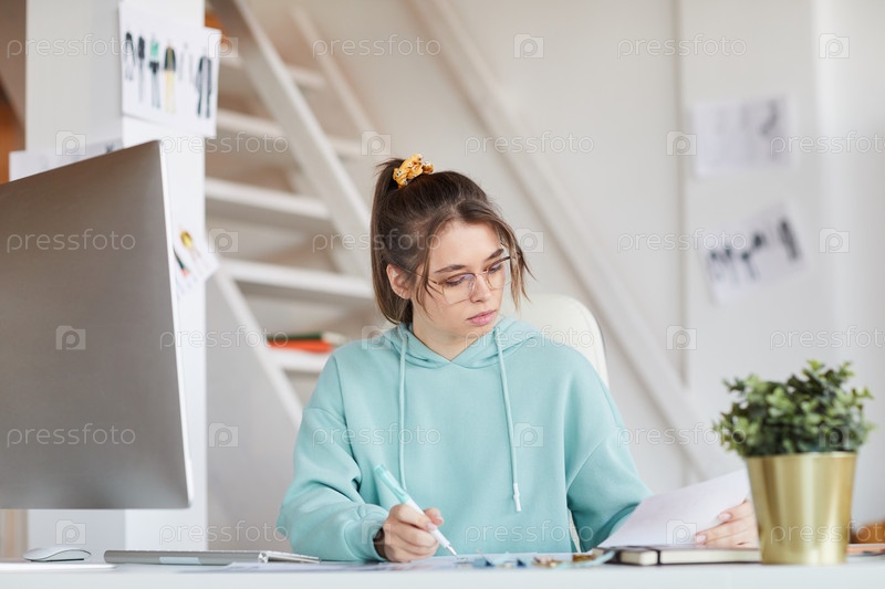 Серьезная молодая женщина в очках и капюшоне сидит за столом и анализирует эскизы для веб-проекта
