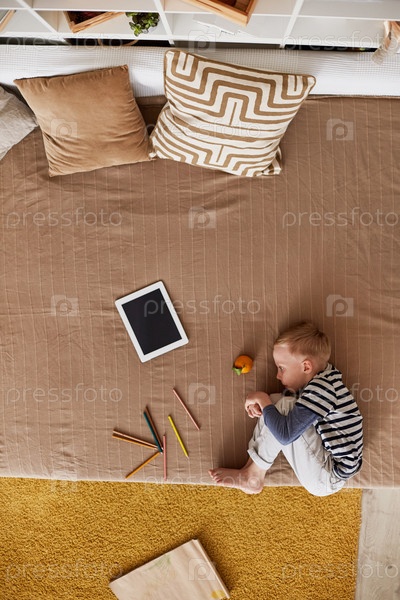 Высокоугольный вид напуганного маленького мальчика с светлыми волосами, обнимающего колени и лежащего на кровати с мандаринкой, планшетом и цветными карандашами