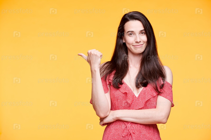 Красивая девушка в элегантном платье держит руки за талию, показывая на сторону пальцем