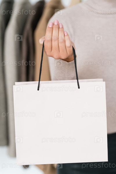 Рука женщины-шопоголика, держащей белый бумажный пакет с покупкой