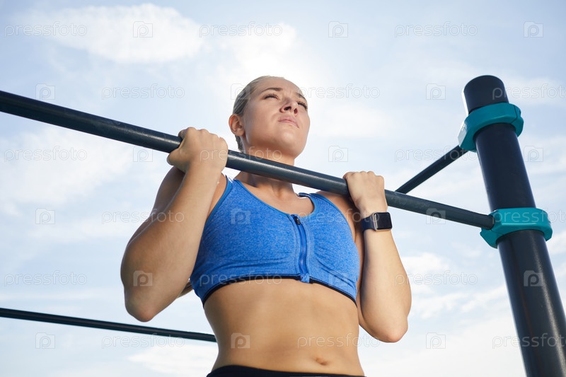 Ниже вид сконцентрированной мощной молодой женщины с фитнес-трекером, висящим на горизонтальной панели во время тренировок в тренажерном зале