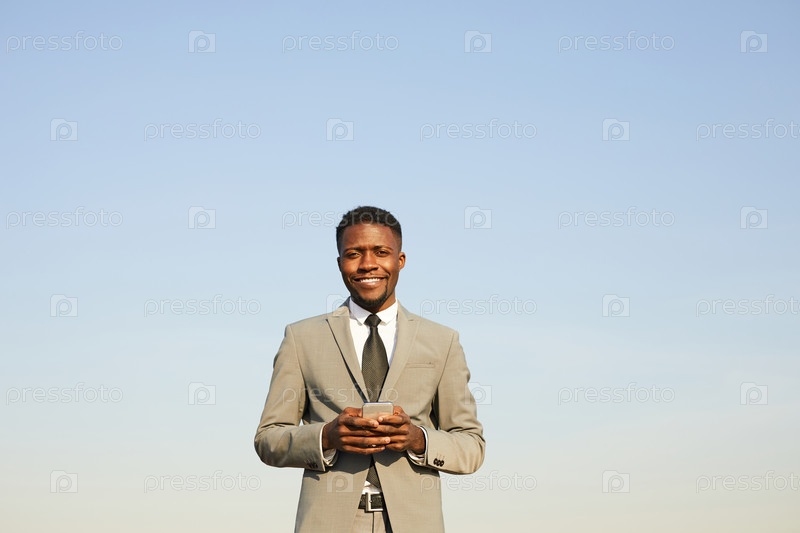 Улыбающийся уверенный молодой афроамериканский бизнесмен с бородой стоял снаружи и использовал современный смартфон, проверяя мессенджер