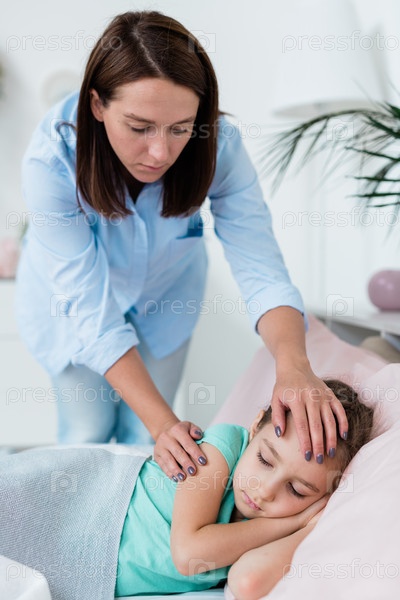 Молодая осторожная мать в повседневной одежде наклоняется над своей больной маленькой дочерью в постели