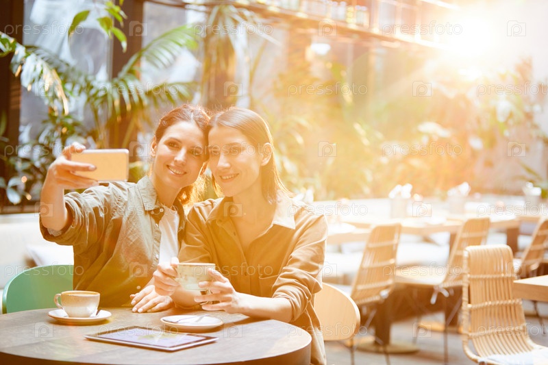Красивые женщины, разговаривающие селфи в тропическом кафе