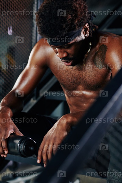 Мышечный мужчина, отдыхающий на металлических ступеньках