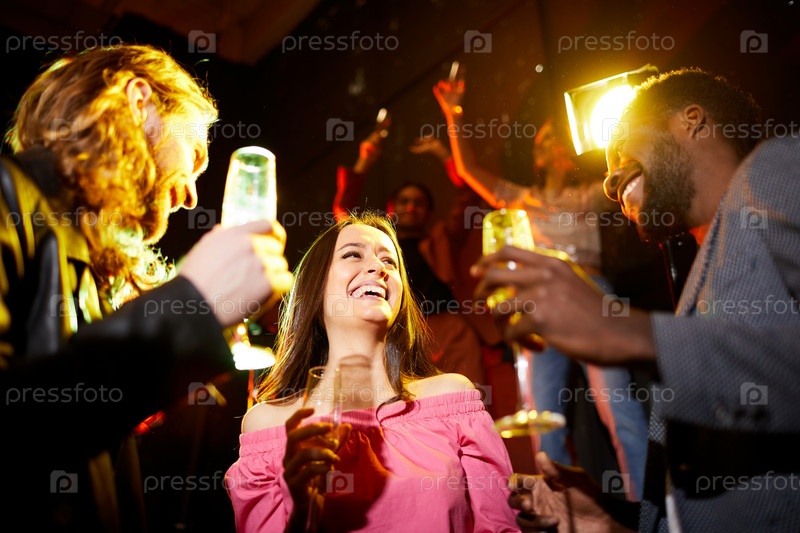 Взволнованная леди между двумя парнями на вечеринке