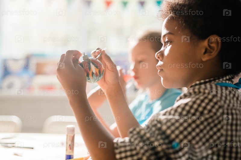 Милый африканский школьник, держащий ручной декоративный рождественский игрушечный мяч