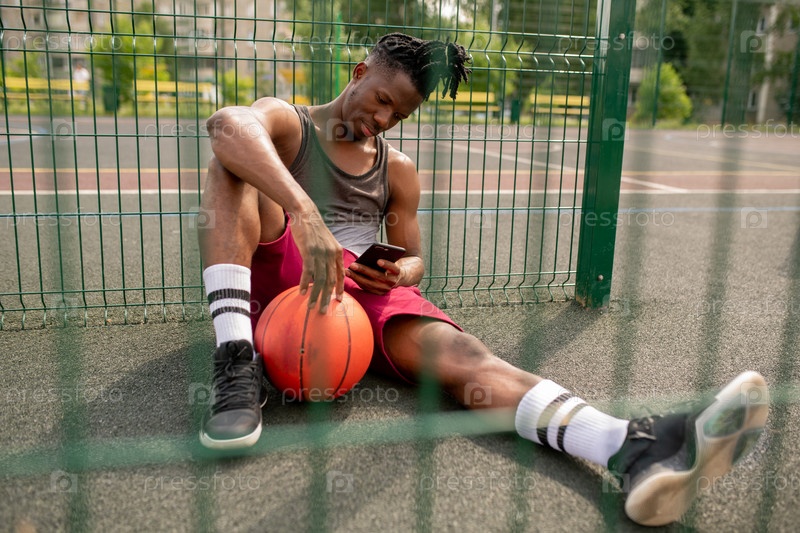 Молодой африканский баскетболист со смартфоном отдыхает у забора игровой площадки