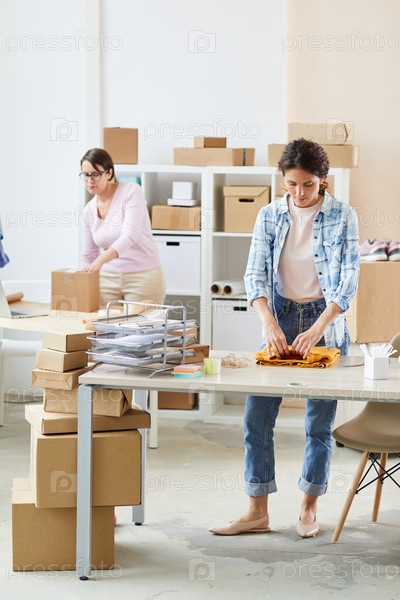 Молодая менеджерка складывает желтый пульвер на столе со своей коллегой на заднем плане