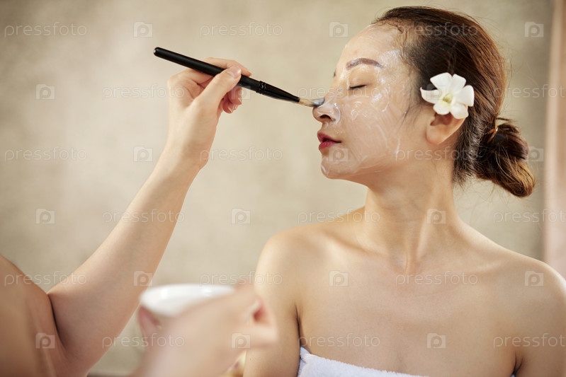 Косметолог наносит кремовую маску для лица