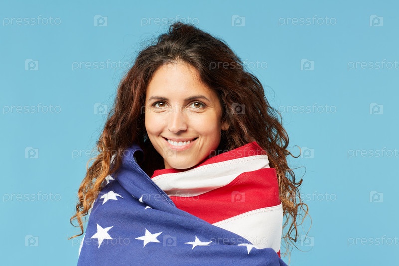 Молодая привлекательная брюнетка, завернутая в национальный американский флаг