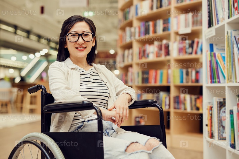 Портрет счастливой брюнетки азиатская студентка в очках, использующая инвалидный кресло для транспортировки в университетскую библиотеку