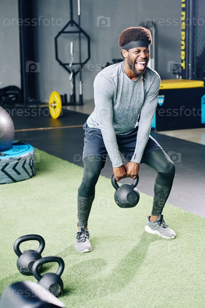 Спортсмен занимается глубоким приседанием с помощью кеттлбелла