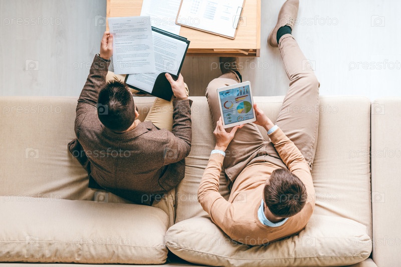 Два молодых экономиста-мужчины анализируют диаграммы и просматривают финансовые документы