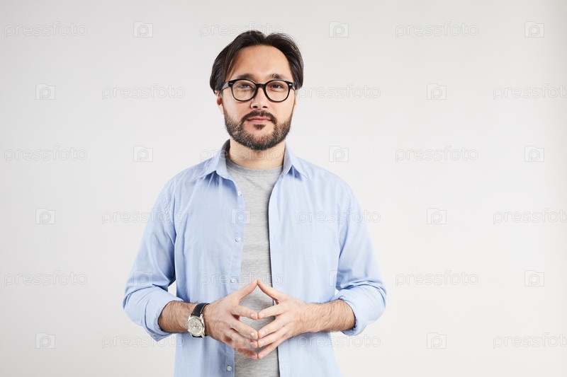 Портрет внимательного молодого азиатского мужчины в рубашке и очках, стоящего на светло-сером фоне и касающегося кончиков пальцев во время размышлений о проблеме