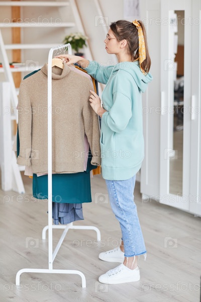 Серьезный молодой дизайнер одежды в непринужденном наряде стоит у стойки для белья и проверяет одежду перед модным шоу