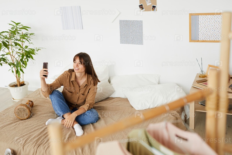 Улыбающаяся студентка с коричневыми волосами сидит на кровати и общается онлайн через мобильное приложение