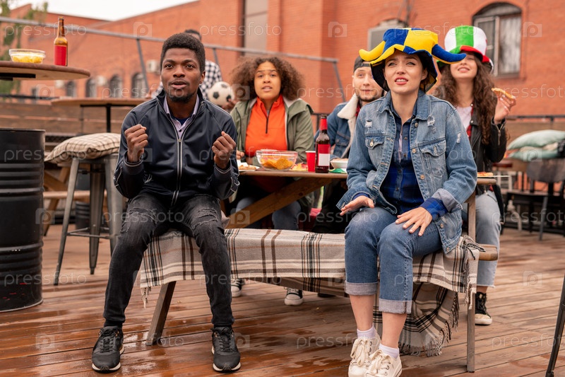 Молодая межкультурная пара и их друзья смотрят трансляцию матча