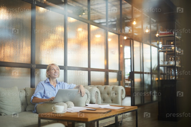 Улыбающаяся мечтательная зрелая женщина с светлыми волосами сидит на удобном диване и использует ноутбук во время подготовки презентации в лофт-кафе