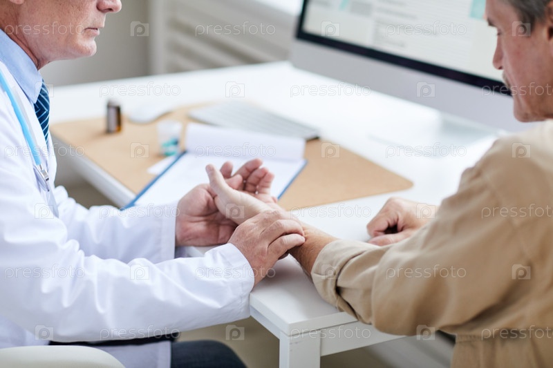 Близкий план серьезного врача-мужчины в лабораторном пальто, сидящего за столом и проверяющего пульс пожилого пациента на встрече