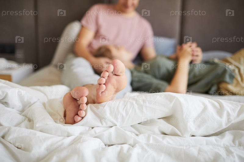 Ногти молодого расслабленного мужчины на белом одеяле во время отдыха