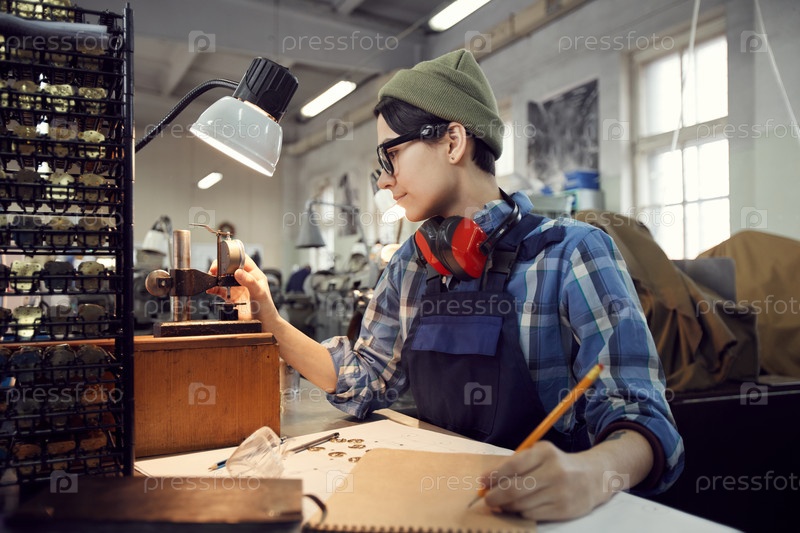 Серьезная молодая женщина-работница часовой фабрики, сидящая за столом и делающая отверстия в тонкой металлической пластине во время записи на эскизной книжке