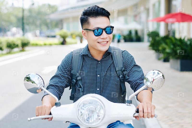 Мужчина едет по городским улицам на скутере