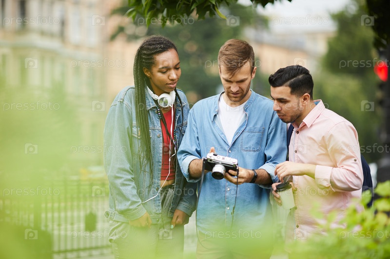 Молодой фотограф в джинсовой рубашке держит ретро-камеру и показывает фотографии моделям, пока они обсуждают композицию фотографий