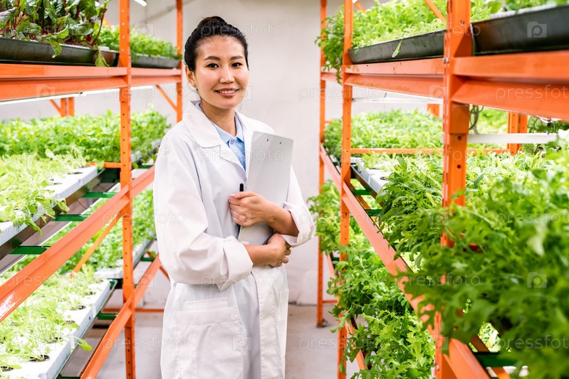 Молодая успешная исследовательница или агроном в белом халате, стоящая на проходе