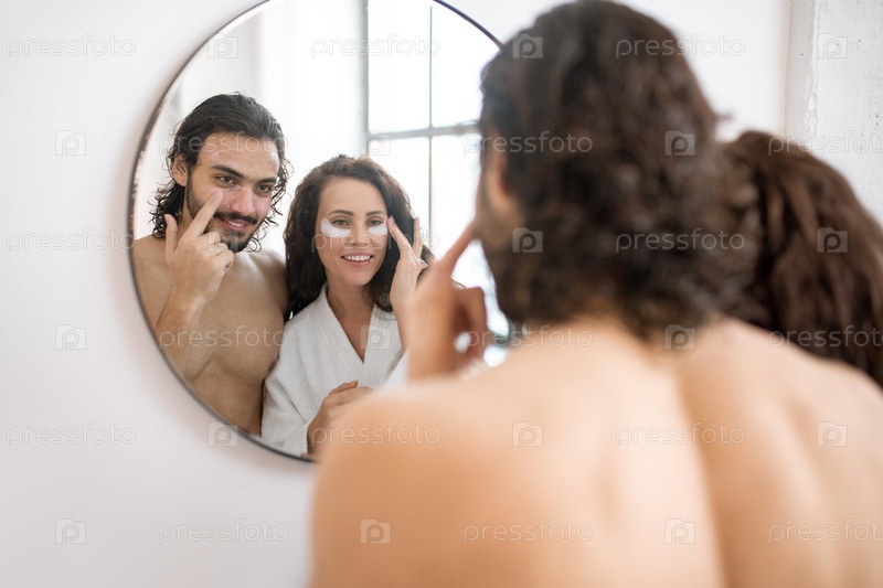 Счастливая пара заботится о нижней части тела, стоя перед зеркалом