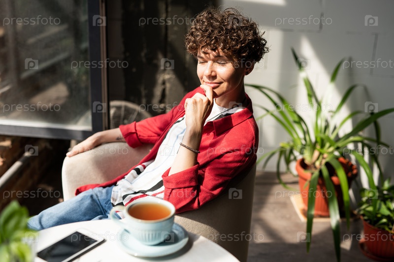 Молодая улыбающаяся женщина в элегантной повседневной одежде наслаждается отдыхом в кресле