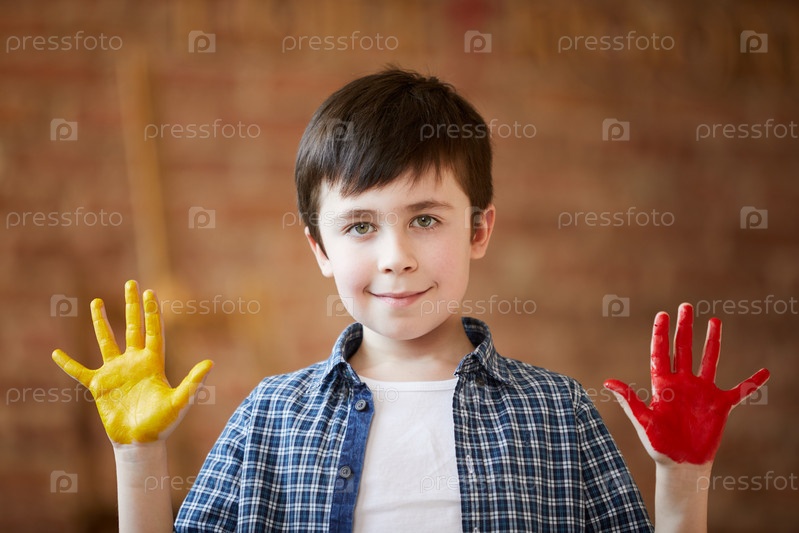 Милый мальчик, рисующий пальцами