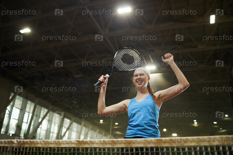 Эмоциональная рыжеволосая молодая теннисистка с ракетой, взволнованная точкой, стоит на площадке при свете проектора и делает жест 'да'