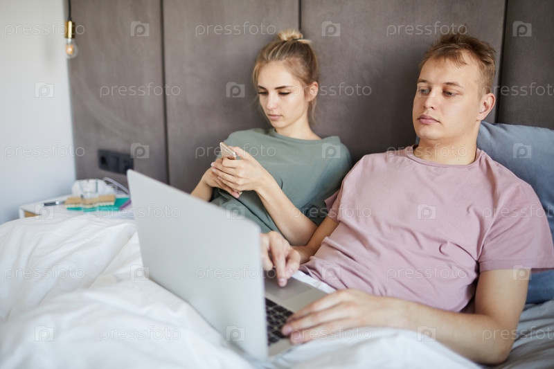 Молодой человек с сетью ноутбука и его жена прокручивают в смартфоне